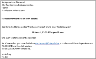 Sie können aber gern eine E-Mail an standesamt@flotwedel.de schreiben und Ihr Anliegen kann am 26.09.2024 beantwortet werden.