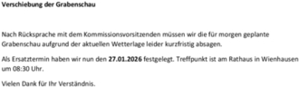 Nach Rücksprache mit dem Kommissionsvorsitzenden müssen wir die für morgen geplante Grabenschau aufgrund der aktuellen Wetterlage leider kurzfristig absagen.