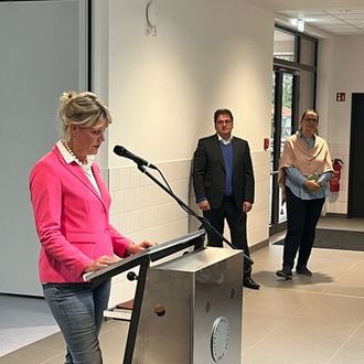 Landrat Axel Flader begrüßte die Gäste im neuen Erweiterungsbau der Albrecht Thaer Schule. Unten noch einige Impressionen. Auch die Schuleiterin Claudia Hermann war hocherfreut über den neuen Bau.