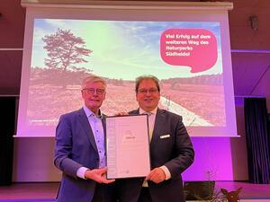 Friedel Heuwinkel überreicht die Urkunde für die Zertifizierung als Naturpark Landrat Axel Flader