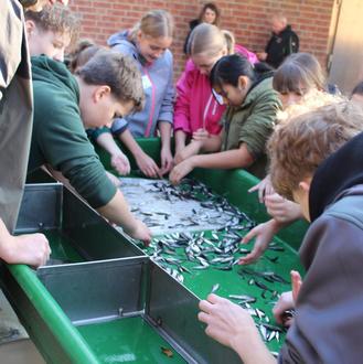 Wieder auf dem Hof angekommen sortieren die Schülerinnen und Schüler bestellte Rotfedern und trennen vermarktungsfähige Schleien und Moderlieschen von eingeschleppten Sonnenbarschen und Laich räubernden Katzenwelsen.