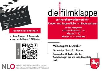 Die Frist der Einreichung von Filmbeiträgen endet am 31. Januar 2025. Die Teilnahmeanmeldung erfolgt über den folgenden Link: https://filmklappe.nibis.de/ oder den QR-Code.