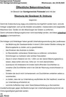 Damit die Grabenräumung zügig und problemlos durchgeführt werden kann, sind alle Anlieger aufgefordert, sich auf die Arbeiten einzustellen. Insbesondere sind abgestellte Maschinen bzw. Geräte von den Böschungen der Gräben zu entfernen.