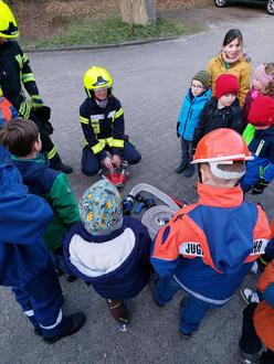 Jetzt konnte es endlich losgehen. Als erstes bekamen alle Kinder und Jugendlichen eine kurze Unterweisung und Erklärung über die verschiedenen Positionen und deren Aufgaben in einer Löschgruppe der Feuerwehr. Es wurden die entsprechenden Positionen genannt, Kinder eingeteilt, benötigte Ausrüstung vom Fahrzeug genommen und aufgestellt, Schläuche gerollt, Strahlrohre angekuppelt. Es gab viel zu tun und zu beachten. Mit toller Unterstützung der Jugendlichen aus der Jugendfeuerwehr, konnten die Feuerfüchse diese Aufgaben hervorragend meistern.