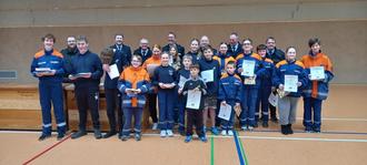 An zehn Stationen erzielten die Nachwuchsbrandschützer bei allgemeinen, sportlichen und feuerwehrtechnischen Aufgaben sehr gute Erfolge. So mussten Schläuche verwoben werden, Knoten erkannt, ein Feuerwehrquiz beantwortet, ein Geschicklichkeitsparcours bezwungen und in einem Hör-Memory passende „Geräusche“ zueinander sortiert werden. „Wichtig sind das Dabeisein und das Miteinander, es wird gelacht und es macht enorm viel Spaß,“ bringen die Teilnehmenden die Sache auf den Punkt.