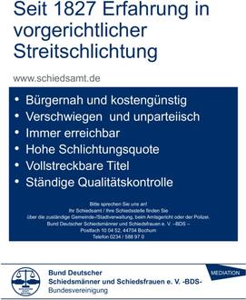 Der „Schiedsmann“ ist ein ehrenamtlich tätiges Organ der Rechtspflege, das die Aufgabe der Streitschlichtung in bestimmten Strafsachen und bürgerlichen Rechtsstreitigkeiten wahrnimmt. In etwa der Hälfte der Fälle kommt es zur Einigung.