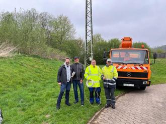 Letztlich mussten wir mit einem SteigerLKW des ÜWL das Nest anfahren, um die Technik(Cam+Kabel) am Ausleger in 15 m Höhe zu erneuern.