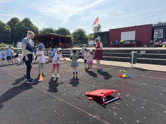 Die Kinder aus Wetteborn wurden mit dem Bus zum Veranstaltungsort gebracht, während die Kinder der anderen Einrichtungen gemeinsam mit ihren Betreuungsteams zu Fuß eintrafen. Dort warteten zahlreiche Stationen auf die kleinen Sportlerinnen und Sportler. Ausgestattet mit einem Laufzettel machten sich die Kinder voller Neugier auf den Weg von einer Aufgabe zur nächsten – und sammelten fleißig Stempel für jede absolvierte Station.