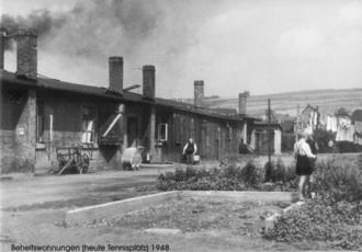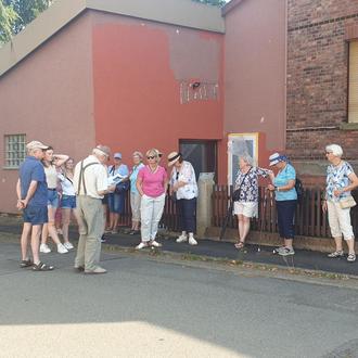 Nach einer kurzen Trinkpause am Sportplatz ging es zurück durch die Waßmannstraße. Hier wies Dieter Greunig auf die Spar-und Darlehnskasse hin, die sich bis zum Neubau des Bankgebäudes am Anger im Jahr 1964 etliche Jahre im Haus der Familie Wode befunden hat. Ein wichtiger Standort für verschiedene andere industrielle Firmen war ebenfalls das Gelände der jetzigen Tennisplätze. So sind hier die Anfänge der Firma “Reifen Ehrhardt“ zu verzeichnen und die Firma Tropitsch stellte dort Steppdecken her. Diese Firmen benötigten natürlich Arbeitskräfte und diese wiederum geeigneten Wohnraum. Es entstanden in der Bilshäuser Straße südlich der Oderbrücke mehrere Häuser, von denen zwei später von Ärzten übernommen wurden.