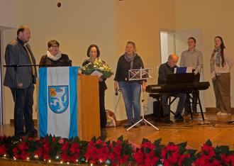 Kevin Kaliner und Frauke Kaliner überreichen im Namen des Gemeinderates einen Blumenstrauß zum Geburtstag an Bürgermeisterin Elvira Schaper, rechts daneben Familie Grünhagen, die das Programm musikalisch begleitet hat.