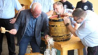 Mit vereinten Kräften wird dem ersten Fass das „kostbare Nass“ entlockt!