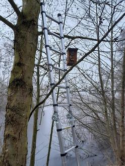 Viele Nistkästen, die im Frühjahr angeboten werden, sind nicht geeignet. Der Brutraum ist oft viel zu klein, die Grundfläche sollte mindestens 12 x 12 cm betragen, sonst wird es für die Kleinen schnell zu eng. Außerdem ist das Material häufig viel zu dünn und isoliert nicht bei Kälte oder bei Wärme. Wer einen geeigneten Kasten selber bauen möchte, der findet zum Beispiel eine gute Bauanleitung beim NABU. Wer sich das nicht zutraut, der kann sich einen fertigen Kasten kaufen. M. Aust empfiehlt aus eigener Erfahrung: „Schwegler Holzbeton Nistkästen“. Sie halten mindestens 20 Jahre und sind seit Jahrzehnten bewährt.
