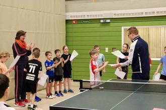 Was für ein Spaß: Nach dem gemeinsamen Vorbereitungsvormittag zusammen mit dem TTC Hattorf in der Woche zuvor stand am 23.01.2025 der 1. Rundlauf Team-Cup (RTC) in der Grundschule an der Sieber in Hattorf auf dem Programm, und alle teilnehmenden Schülerinnen und Schüler der 3. und 4. Klassen der Grundschule waren mit Feuereifer dabei! Es war wirklich eine Freude, den Kindern dabei zuzusehen, die sich so tolle Teamnamen wie „Die schlauen Füchse“ oder „Die 5 Freunde“ gegeben hatten. Pro Jahrgang wurde klassenweise in verschiedenen Gruppen gespielt, wonach klassenübergreifende Halbfinals und weitere Platzierungsspiele anstanden. Und egal, wie gut es im Einzelnen klappte oder welche Höhen und Tiefen dabei im Einzelnen durchlebt wurden - immer wieder gaben die Kinder alles und gingen dabei äußerst fair & sportlich miteinander um. Gleichzeitig feuerten die Teams ihre Vertreterinnen und Vertreter voller Inbrunst an, wenn es in den Finals um entscheidende Punkte ging. Am Ende waren es im 3. Jahrgang „Die Fußhandballer“ aus der 3b, die ihre Klassenkolleginnen „Die Michalilos“ auf Platz 2 verweisen konnten, nachdem sie ihnen in der Gruppenphase noch knapp unterlegen gewesen waren, „Die Immertreffer“ aus der Klasse 3a belegten Rang 3. Bei den 4. Klassen behielten „Die Wilden Kerle“ aus der 4b die Oberhand über „Die