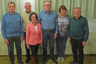 der neue im Amt bestätigte Vorstand: Hausmeister Helmut Peinemann und Hermann Bode, 2. Vorsitzende Elvira Schaper, 1. Vorsitzender Uwe Peinemann, Schriftführerin Edit Könneker, Rechnungsführer Gerhard Lüer