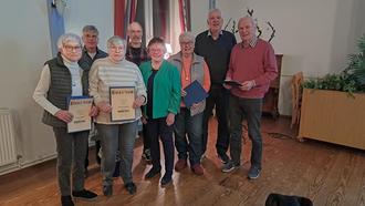 Ein Teil der Geehrten mit den beiden Vorsitzenden: v.l. Ursula Minne, Ralf Schüssler, Waltraut Köhne, Rainer Starfinger, Inge Köhler, Gundula Barke, Rolf Hosang, Otto Lohrengel.