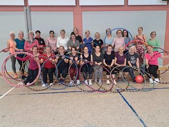 Mit 26 Teilnehmerinnen trainierte die zertifizierte HulaHoop-Trainerin und HulaHoop-Dance-Trainerin Isabell Hartmann mit dem Hula-Hoop-Reifen. Einige der Teilnehmerinnen waren bereits beim letzten Workshop im November 2024 dabei. Mit den effektiven Ratschlägen der Trainerin konnten auch die weniger geübten Teilnehmerinnen nach kurzer Zeit den Reifen schwungvoll um die Taille kreisen lassen. Doch bevor es so richtig los ging, wurde der Reifen als Übungsgerät beim Warmup benutzt. Danach begann das Fitnesstraining mit den unterschiedlichsten Übungen wie z.B. gehen, auf die Knie kommen, Ball werfen, auf die Bank steigen usw. und das alles mit dem HulaHoop-Reifen. Die Teilnehmerinnen lernten ebenfalls, im Squat zu hullern oder den Reifen beim Hullern in Hüft- oder Brusthöhe zu halten. Isabell hatte Reifen in unterschiedlichen Größen und mit unterschiedlichen Gewichten mitgebracht, so dass ausprobiert werden konnte, was diese Unterschiede beim Hullern bewirkten.