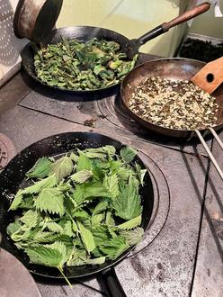 Es gab gebackenes Brot aus dem Holzbackofen, Wildpflanzensalat, gefüllte Lindenblätter, Brennnesselchips, Bärlauchhummus und Tannenspitzenbutter.