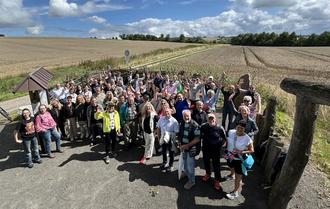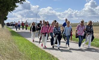 Von Wilhelm Sonntag wurden sie über den Hintergrund dieses besonderen Platzes informiert. Sonntag erläuterte, dass es Klaus Bertram war, der auf dem nahegelegenen Acker Oberflächenfunde machte, die auf eine jungsteinzeitliche Siedlung hinwiesen. Mehrere durchgeführte Grabungskampagnen führten den Beweis, dass hier die ersten Bauern vor 7.200 Jahren siedelten. Es wurden insgesamt 7 Hausgrundrisse nachgewiesen. Eine Nachbildung des komplett ergrabenen Langhauses befindet sich im Hus in Dieke.