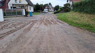 Der Regen hat dafür gesorgt, dass die Mühlenstraße von Unmengen an Schlamm bedeckt war. Foto: Schrader