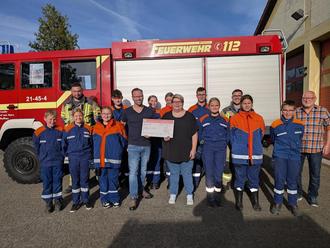 Mitte Benjamin Waßmann und Frauke Kaliner WZW mit Scheck, hinten links Lukas Krause Jugendleiter, rechts Willi Ehrhardt WZW und aktive Jugendfeuerwehrleute. Text u. Foto: Ehrhardt
