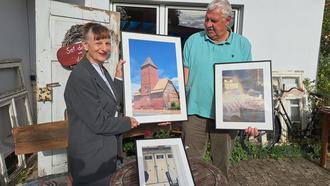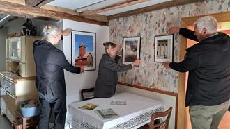Sabine Groschup, die Wiener Künstlerin, die sich sehr zu Hattorf hingezogen fühlt, hatte im letzten Jahr eine Sonderausstellung im Meierhof gestaltet. Ein Teil Ihres künstlerischen Schaffens ist die Photografie. Es entstanden über einen Zeitraum von mehr als 10 Jahren viele besondere Aufnahmen mit besonderen Blickwinkeln von Hattorf. Von diesen besonderen Motiven, die auch nur limitiert auf dem Kunstmarkt verfügbar sind, bekam das Dorfmuseum nun 3 Exponate geschenkt. Bei der Übergabe mit dem 2. Vorsitzenden Rolf Hosang (Bild 1) wurde in den Räumlichkeiten gleich der richtige Platz gesucht und gefunden. Das Bild Nr. 2 zeigt ein „Probeanhalten“, um zu entscheiden, das es der richtige Ort ist.