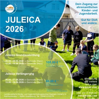 Im Mai und Juni findet in Gernrode unsere Juleica-Grundausbildung statt. Hier lernen junge Menschen ab 14 Jahren alles Wichtige rund um Gruppenpädagogik, Programmgestaltung, Kommunikation und mehr. Wer später als Betreuer/in Feriencamps oder Jugendgruppen arbeiten möchte, ist hier genau richtig! Darüber hinaus bieten wir Auffrischungs-Seminare an.