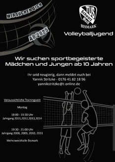 Ab Januar 2025 will der TuS Schwarz-Weiß Bismark mit Volleyball-Jugendmannschaften an den Start gehen und daher suchen wir sportbegeisterte Mädchen und Jungen ab 10 Jahren.