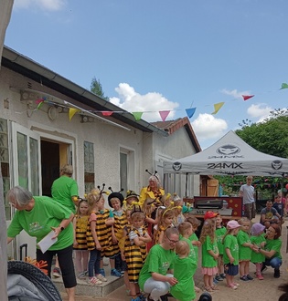 Als Blumen und Bienen verkleidet, begrüßten die Kinder den Frühling und boten den zahlreichen Gästen, Eltern und Großeltern ein tolles Programm. Das Außengelände war restlos mit Sitzgarnituren belegt und es blieb kein Platz frei. Freunde und Förderer bereicherten das Fest u.a. mit einem tollen Kuchenbuffet, Ponyreiten und der beliebten Kübelspritze der Ortsfeuerwehr Hohenwulsch.