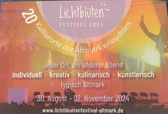 Nachdem das Projekt Lichtblütenfestival als letztes LEADER Kooperationsprojekt in der abgeschlossenen LEADER Förder-Phase altmarkweit ein voller Erfolg war und so förmlich nach einer Fortsetzung "rief", ist es gelungen, mit anderen Fördermöglichkeiten und Sponsoren für den Herbst 2024 20 Standorte für das "Lichtblütenfestival 2024" zu aktivieren und so wieder Kulturorte der Altmark wunderschön zu erleuchten.