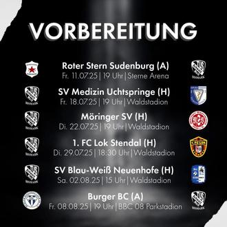 Die Voigt-Elf wird neben zahlreichen Trainingseinheiten bis zum Saisonstart gegen die Landesklasse-Vertretung des SSV 80 Gardelegen e.V. Fußball (Freitag, 01.08.25 - 18:30 Uhr im Waldstadion) und beim SV Schwalbe Schwiesau (Sonntag, 10.08.25 - 14 Uhr) ihre Form testen.