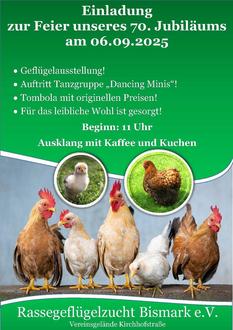 Bereits seit 70 Jahren ist die Rassegeflügelzucht in Bismark als Verein aktiv. Das ist ein Grund zum Feiern. Am 06.09.2025 findet am Vereinsgelände in der Kirchhofstraße die Jubiläumsfeier statt. Am Morgen messen sich die Vereinsmitglieder, um die besten Bewertungen und Pokale für ihr Rassegeflügel zu erringen.