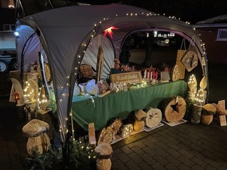 Ein schmucker Pavillon mit dem Motto „Rustikale Weihnachtsdeko“ wurde am diesjährigen Nikolausmarkt von Ralf Schulze und Peter Pudschun präsentiert. Die in liebevoller Handarbeit von Ralf Schulze hergestellten Objekte (Sterne aus Kiefernholz, Kerzen und Pilze aus Birke, Engel usw.) wurden zum Verkauf angeboten.