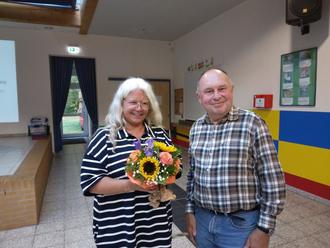 Dieter Johann überreicht ein Blumenpräsent an Frau Pohland