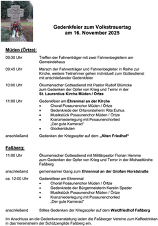 | 10:00 Uhr | Ökumenischer Gottesdienst mit Pastor Rudolf Blümcke zum Gedenken der Opfer von Krieg und Terror in der St. Laurentius Kirche Müden / Örtze |