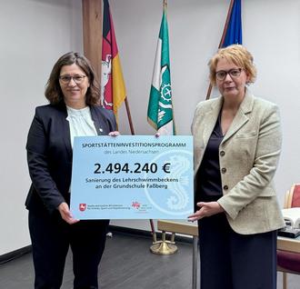 Niedersachsens Innenministerin Daniela Behrens (re.) übergibt symbolisch die Zuwendung für die Sanierung des Faßberger Lehrschwimmbeckens in der Grundschule an die Bürgermeisterin Kerstin Speder.