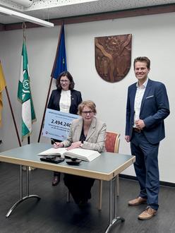 Ministerin Behrens überreichte den Förderbescheid persönlich und würdigte das Engagement der Gemeinde und der Bürgerinnen und Bürger für den Erhalt des Lehrschwimmbeckens. Bei der Gelegenheit wünschte sie mit dem Eintrag ins goldene Buch der Gemeinde „viel Erfolg bei der Umsetzung dieser wichtigen Maßnahme!“.