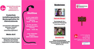 Es handelt sich um eine telefonische Hotline ohne lange Wartezeiten und Fahrwege. Über diese sollen Alleinerziehende (auf Wunsch auch anonym) unterstützt und in allen sozialtherapeutischen Themen beraten werden. Folgetermine können bei Bedarf in Absprache mit der Beraterin vereinbart werden. Gefördert wird die Hotline durch das Niedersächsische Ministerium für Soziales, Arbeit, Gesundheit und Gleichstellung.