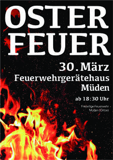Die Ortsfeuerwehr Müden (Örtze) lädt herzlich zum Osterfeuer am Samstag, den 30.03.2024 ein. Das Osterfeuer wird in diesem Jahr wieder rund um das Feuerwehrhaus in der Alten Dorfstraße stattfinden. Beginn ist um 18:30 Uhr.