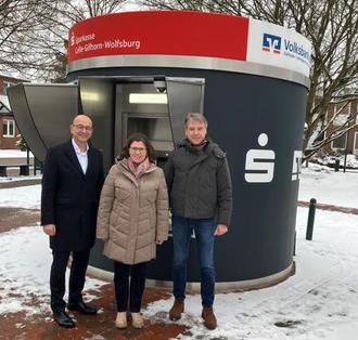 Ein- und Auszahlungen möglich: Stefan Gratzfeld (l.) mit Kerstin Speder und Frank Bonin vor dem neuen SB-Pavillon in Faßberg.