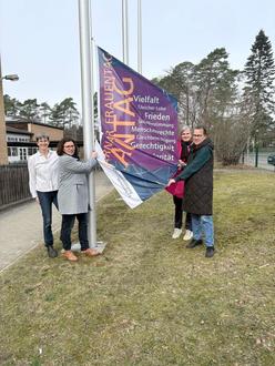 Gemeinsames Hissen der Fahne an der Lerchenschule als sichtbares Zeichen für Gleichberechtigung, Respekt und Zusammenhalt (v.l. Kerstin Barsch vom Familienbüro, Bürgermeisterin Kerstin Speder, die Müdener Ortsvorsteherin Rita Euhus sowie die Gleichstellungsbeauftragte Viktoria Dichter)