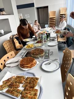 Nach dem Flaggenhissen durch die Bürgermeisterin und unserer Frauenbeauftragten begaben sich 11 Frauen mit ihrem kulinarischen Beitrag in die Küche der Lerchenschule. Mit viel Spaß und Freude wurde das internationale Essen angerichtet. In jeder Kochkoje entstand ein Menü. Auf dem Essensplan standen eine Cashew Reis Hack Torte, sowie syrischer Pfannkuchen mir Tomatenaufstrich, Pellkartoffeln mit Eiersalat, Nudeln mit Hackfleischbällchen, Linsencurry und gemischte Salate. Eine Quarkspeise mit gemischtem Obst rundete das internationale Essen ab. Anschließend fand beim gemeinsamen Mahl ein Erfahrungsaustausch statt.