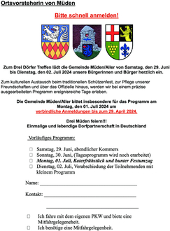 Die Gemeinde Müden/Aller bittet insbesondere für das Programm am Montag, den 01. Juli 2024 um