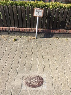 Das beigefügte Foto zeigt einen Unterflur-Hydranten. Jeder Hydrant ist mit einem Hinweisschild ausgestattet, das ebenfalls im Bild zu sehen ist und beim Auffinden des Hydranten hilft. In diesem Fall befindet sich der Hydrant 1,4 Meter in gerader Linie vor dem Schild. Die freien Felder rechts und links der senkrechten Linie auf dem Foto zeigen die seitliche Entfernung des Hydranten vom Schild an.