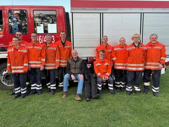 Das Bild zeigt Kräfte der Einsatzabteilung der Feuerwehr Poitzen, den Dummy und Volker Tewes.