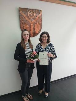 Übergabe Bestellungsurkunde zur Standesbeamtin (v. l. Merle Brenner, Bürgermeisterin Kerstin Speder)