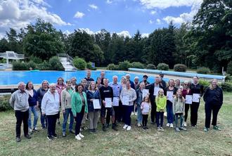 Die Teilnehmerinnen und Teilnehmer an der Abschlussveranstaltung im Waldschwimmbad Herrenbrücke