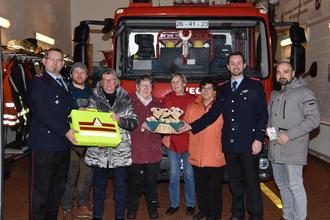 Übergabe des Notfallkoffers (v. l.): Ortsbrandmeister Timo Gebhardt, 2.Vorsitzender Förderverein Timon von der Heide, 1.Vorsitzende DRK Ingrid Bartsch, 2.Vorsitzende Karin Harder, Elisabeth Henze, Helga Schwarze, stellv. Ortsbrandmeister Sven Groth, 1.Vorsitzender Förderverein Carsten Fischer.