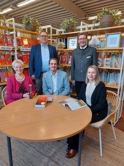 (vorne v. li.) Die stellvertretende Büchereileiterin Andrea Heuß-Stegen, Ingo Gräper von der Sparkasse Harburg-Buxtehude, Büchereileiterin Donata Kulpok-Kurka sowie (hinten v. li.) Philippe Ruth und Falk Pilath vom Fachbereich Ordnung und Soziales freuten sich über die neue Leseecke.