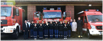 Fröhliche Gesichter bei der Übergabe der Hoodies am Hanstedter Feuerwehrhaus.