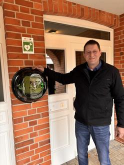 Bürgermeister Matthias Kruse freut sich über die Installation des öffentlich zugänglichen Defibrillators in der Schulstraße 48.